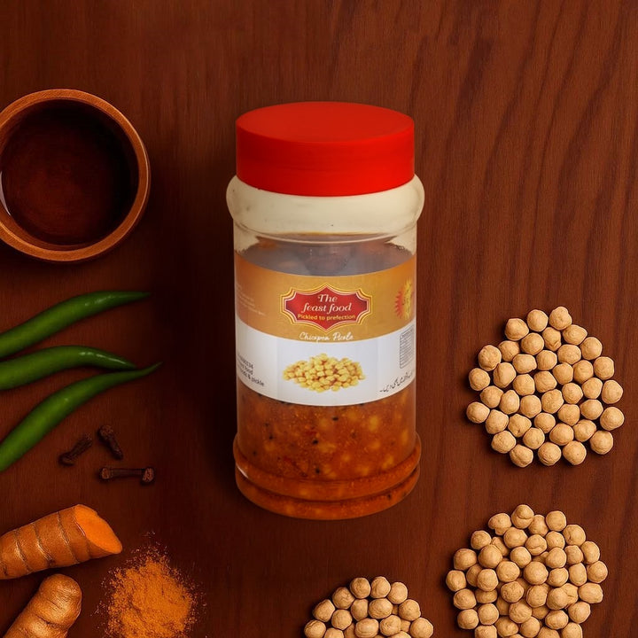 Ingredients: Boiled Chickpeas, Mustard Oil, Salt, Red Chili Powder, Mustard Seeds, Fenugreek, Fennel Seeds, Vinegar.
