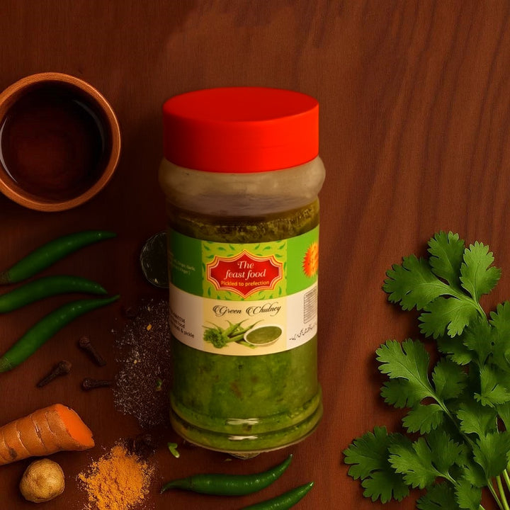 Ingredients: Coriander, Mint Leaves, Green Chilies, Lemon Juice, Salt, Cumin Seeds, Vinegar, Black Salt.